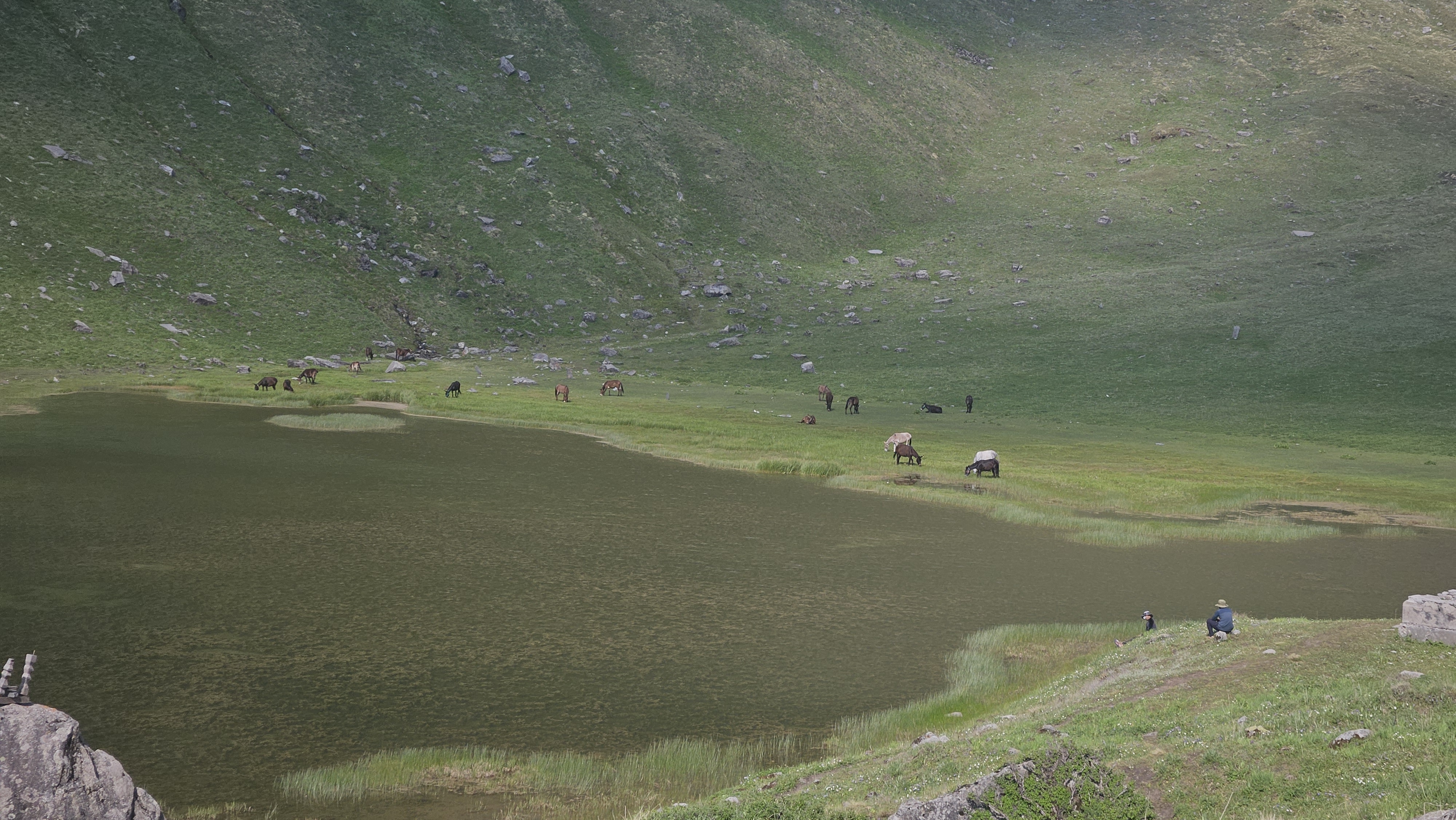 Today’s stretch was almost waterless but a long 11 km, and I had to lug a heavy 45 L bag up the undulating trail. This put my pack weight out of my comfort zone, and I was melting under the dizzying sun. There’s a hole in the ozone layer—confirmed by my skin that day—which is why you’ll never see sunscreen less than SPF 30 for sale. In other words, not the place to experiment with how much you can tan on day two. We had lunch in the meadows, packed at the start of the day. We rested, hydrated, and then got to know we were still more than halfway from today’s campsite. Then came an unexpected forest descent—which none of us were ready for. The air was humid, and it felt like walking through a true rainforest. From afar, we could see our destination—so close yet so far. It was 5 PM when we first caught a glimpse of our tents at the campsite. We filled our bottles from a sweet water stream and changed clothes. Locals and sherpas told us there’s a lake a little above—said to be the highest at this altitude.