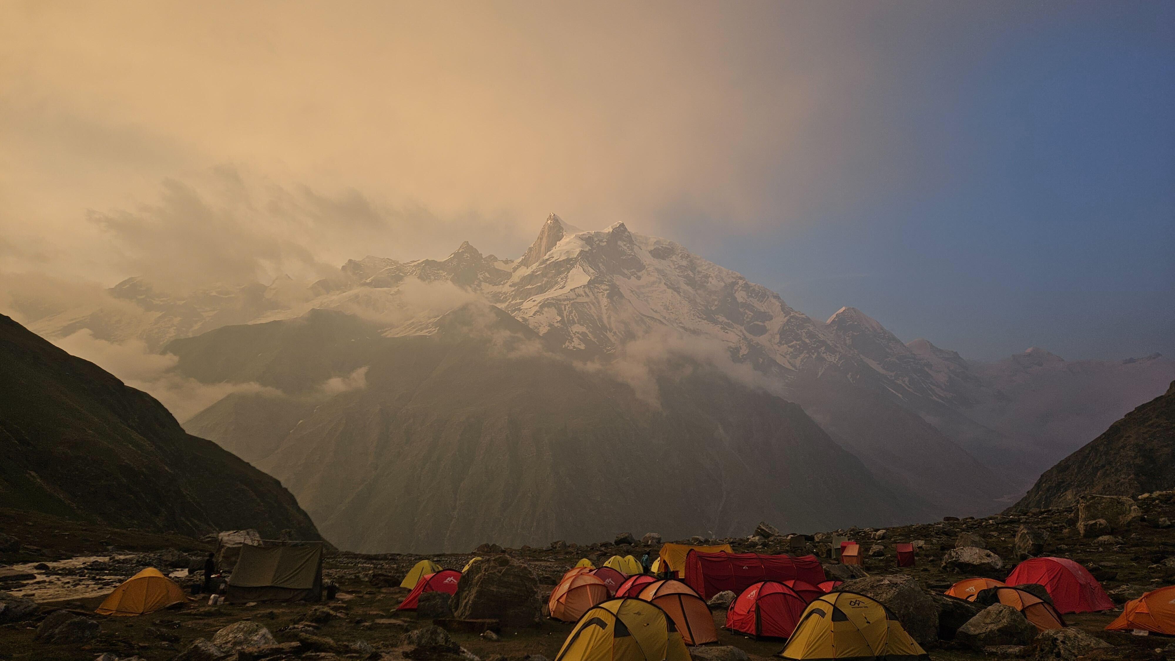 As the altitude increased, the air got colder. The weather forecast for our summit day looked worse, so we decided to acclimatize here. Our next day was Odhari camp—the last one before base camp. The trail was fairly moderate, so we covered it before noon. On the way, we kept hearing about “Black Peak”—a 10–15 day expedition, one of the toughest in the region. Very few teams had completed it this year. When we reached Odhari, mist wrapped the peaks and visibility kept dropping. There was a moment when everyone left their tents and just stood there, mesmerized. The peak you see here is the highest—Swargarohini I (6,252 m). Mythologically known as the “Stairway to Heaven,” it’s believed to be the path taken by the Pandavas in the Mahabharata. The legend says Swargarohini was the only path from which a human (only Yudhishthira, the eldest and most righteous) could reach heaven in a mortal body. Many have spent dollars to achieve this summit and remained unsuccessful.